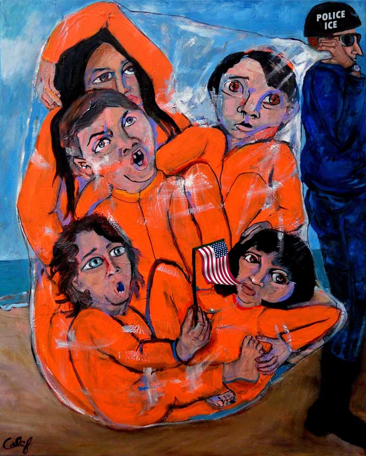 Calef fearlessly addresses political issues with humor. Juxtaposing historical figures, characters and places, adding colorful details, including sculpture, fabric and found objects, she highlights